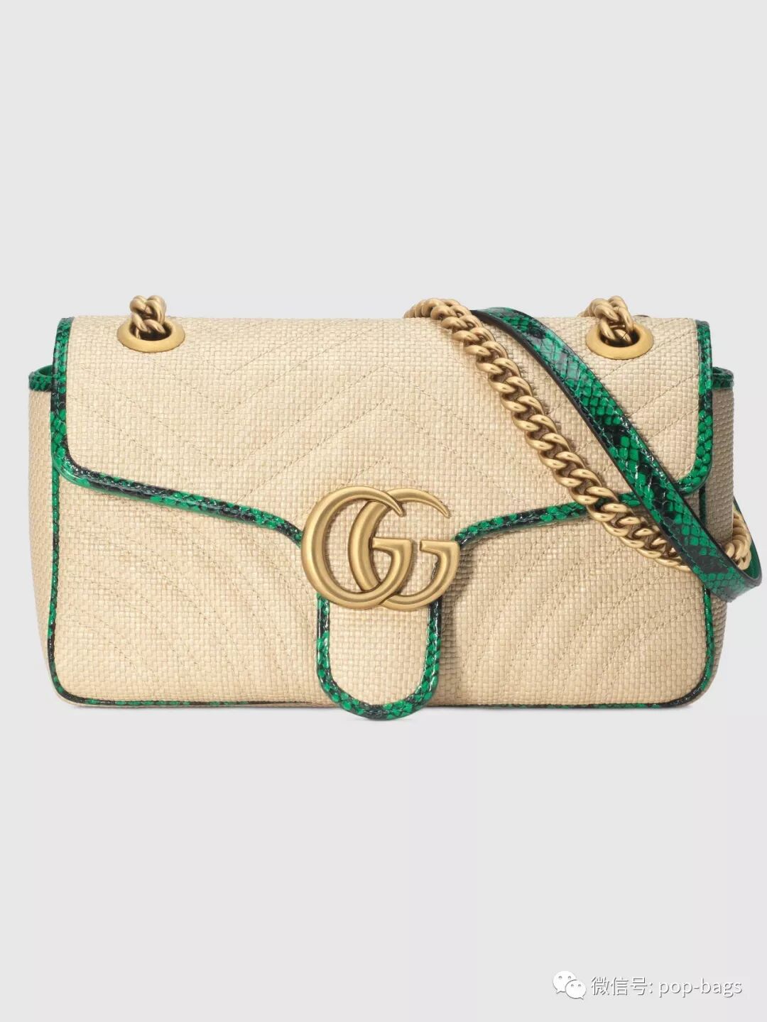 GG Marmont系列突出轻松格调与实用性,其中包括两种尺寸:质感柔软的人造拉菲草托特包,和采用拉菲草钩针编织带有花卉图案的柔软轻盈肩背包。两款设计兼具实用及便利性,天然底色表面搭配红绿色或黑色饰边,肩背包并配有闪亮的金属链带。